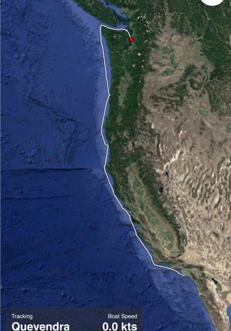 We arrived on May 31st in Crescent City, CA. The last marina in California. We were greeted on the docks by a local fisherman describing this place as "the best marina on the West Coast". It sure looked very new, as it had all been rebuilt fresh after being destroyed by a tsunami that originated from an earthquake in Japan several years ago. So we left the boat in this best marina on the West Coast for a week and drove home, to await the next big weather window. For that last leg, I had to stay back due to work. John, Bones, and another crew returned and completed the trip to Washington state.