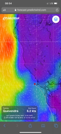 In a few days, another potential window began to open. This one was a very tentative one - one high-pressure system located offshore, with 30+ knot winds, being slowly pushed out by low pressure coming from the Bay Area. The low pressure would actually build up to 25+ winds as well, but from the south. For us to make use of it, we had to time everything right, and the forecast had to hold perfectly - leave Half Moon Bay at midnight, to start moving with the low system, but go past Bay entrance before it starts building up. Then continue with the low pressure as it pushes the strong north winds out just ahead of us. If anything changed in the forecast, we would need to quickly find some refuge in one of the few harbors present on this stretch of the coast north of SF. All that forecasting and route planning was provided to us by our mentors and routing experts - Behan and Jamie of SailingTotem. This was all to let us pass Cape Mendocino - one of the most notorious capes on this coast, famous for creating its own weather. We did that on the morning of May 30th, with me at the helm. I can only imagine what people rounding Cape Horn feel. This was my first cape to round, and it felt great.