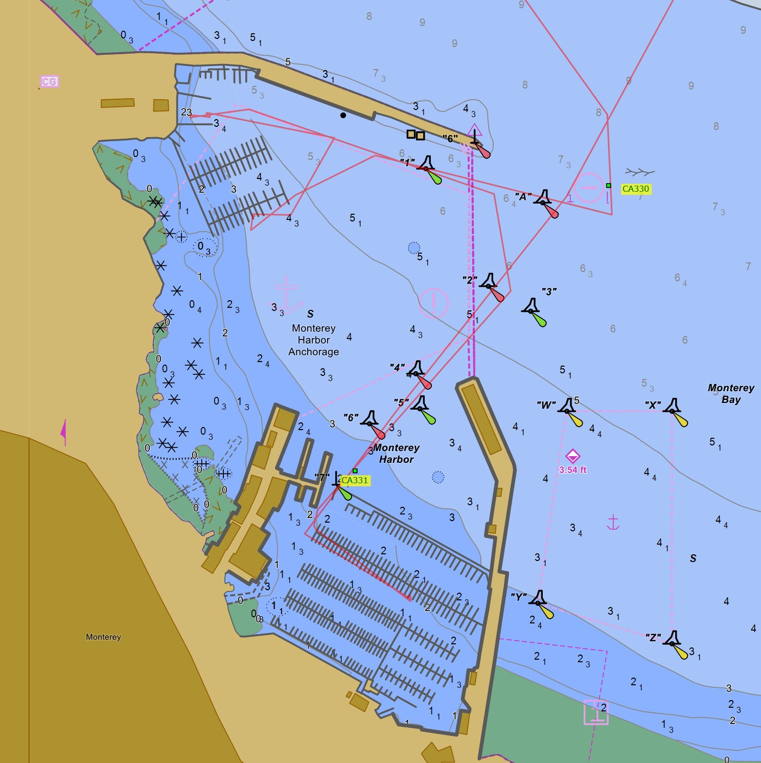 Monterey Harbor provides a choice of two marinas and an anchorage. The marinas are somewhat protected by two breakwaters, one on the east side and one on the north. I say "somewhat" because wave surge is still noticeable inside the marinas. The marina in the northwest corner is the Breakwater Cove Marina. It is a private one and the smaller of the two. The docks are in good condition and were the first place where we found single-boat docks, which are popular in California. You have two finger docks, one on each side of the boat, making the docking somewhat less stressful. It has good showers, laundry, and a chandlery next to a small boatyard, where some repairs can be made.