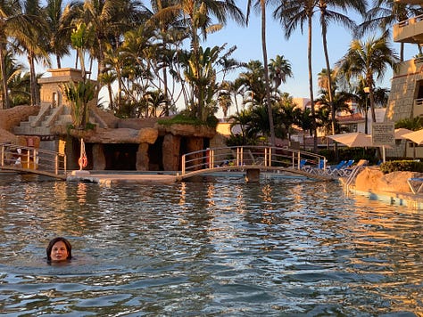 Our friends, who happened to be vacationing in Puerto Vallarta when we arrived, invited us to their hotel. It was a spectacular place, nestled in the hills above the town, with incredible views, infinite pools, and just a great atmosphere. We enjoyed dinner there and had a fantastic evening.